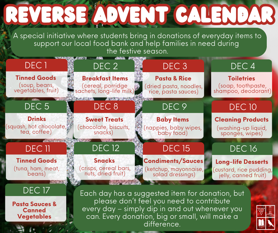 We are excited to announce that our Reverse Advent Calendar will begin this Monday! This is a special initiative where students bring in donations of everyday items to support our local food bank and help families in need during the festive season.